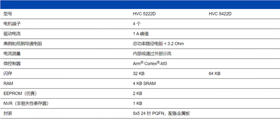 最新款電機控制器型號 HVC 5222D 和 HVC 5422D 分別提供 32 KB 和 64 KB 的擴展閃存容量,BLDC 和步進電機支持高達 1 A 的電流,直流電機支持高達 2 A 的電流,外加先進的電機專用功能,例如針對微步進和集成相位電壓比較器的電流編程、虛擬星點,以及面向基于傳感器和無傳感器電機控制的電流檢測放大器等,符合 ISO26262 標準,并適用于 ASIL 應用。