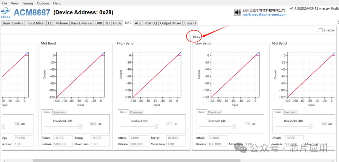 另外一個(gè)弊端例如傳統(tǒng)DRC信號突變時(shí),前幾個(gè)波形失真的問題。由于傳統(tǒng)DRC是計(jì)算RMS,必然有幾個(gè)周期的波形是可能失真的。ACM8687除了RMS DRC之外,采用專利技術(shù),加入PEAK檢測。信號經(jīng)過peak加權(quán)后跟RMS值比較,決定先進(jìn)入peak DRC還是RMS DRC。例如前幾個(gè)波形失真問題,可以通過調(diào)整peak DRC的attack來調(diào)整失真。