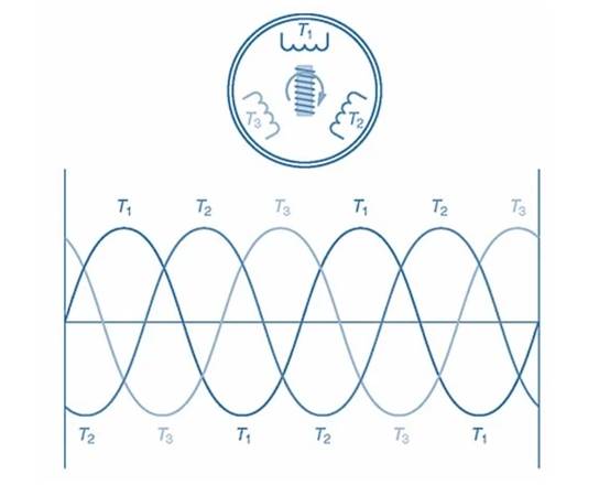 圖 2 說明了施加到定子繞組的三相交流電源。三相電源每120°產(chǎn)生一個(gè)峰值電壓。