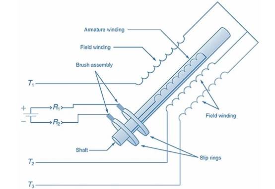 同步電機(jī)(如圖 5 所示)具有三相定子、繞線轉(zhuǎn)子、滑環(huán)和電刷。然而,與繞線轉(zhuǎn)子感應(yīng)電機(jī)的三個(gè)繞組相比,轉(zhuǎn)子具有單個(gè)繞組。轉(zhuǎn)子還包含類似于鼠籠式電機(jī)轉(zhuǎn)子的短路棒。同步電機(jī)引線對(duì)于定子連接標(biāo)記為 T1、T2 和 T3,對(duì)于轉(zhuǎn)子連接標(biāo)記為 R1 和 R2。直流電源為轉(zhuǎn)子供電。