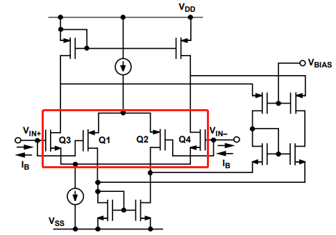 我們不難發(fā)現(xiàn),與前文三種不支持軌到軌的輸入架構(gòu)相比,軌到軌輸入運(yùn)放在輸入的時候額外多了一對管子,無論是三極管還是MOS管。