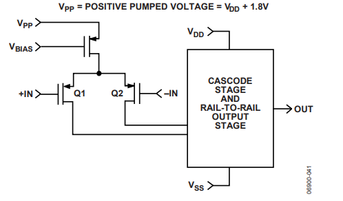 內(nèi)部電荷泵用一個高電壓,可以使輸入信號始終經(jīng)過一個差分對而不跳到另外一個。某種意義上,是從根本消除了交越失真。