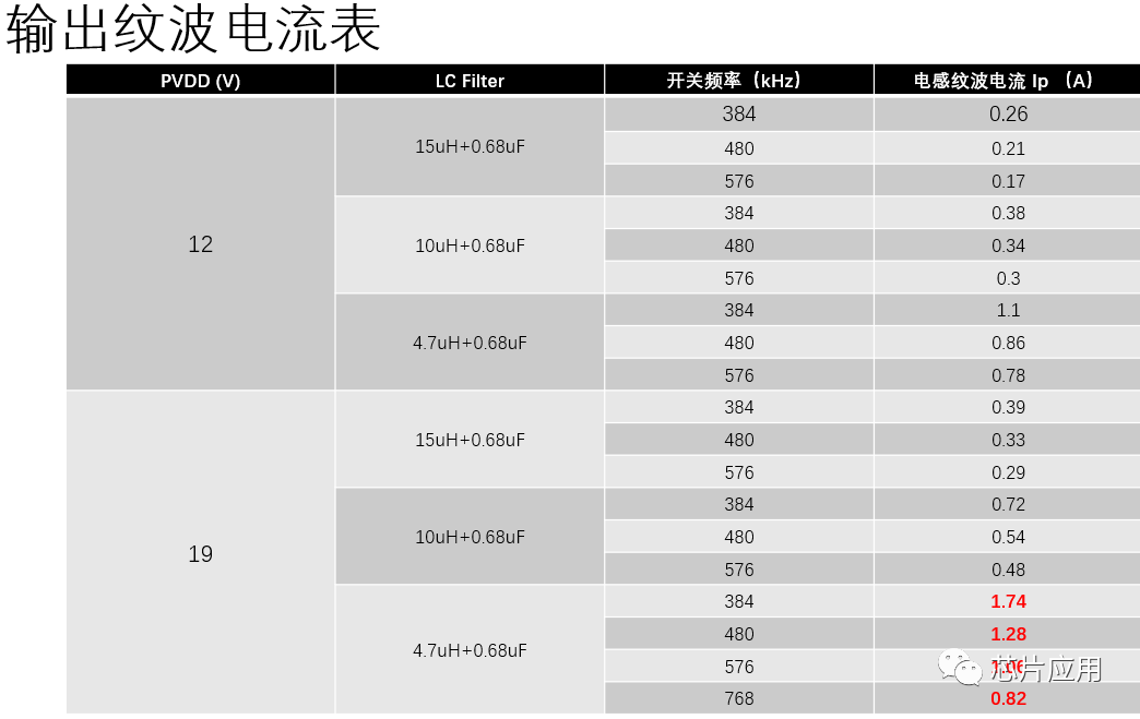 開關頻率越高,紋波電流越。浑姼性酱,紋波電流越小。一般為了降低音頻功放自身的switching loss, 推薦開關頻率采用480kHz, 因此一般建議電感在大于12V的情況下,電感不要低于10uH。