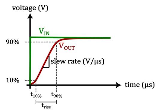 圖 1.運(yùn)算放大器輸出的壓擺率限制,上升時(shí)間由trise表示。圖片由羅伯特·凱姆提供壓擺率通常以伏特每微秒 (V/μs) 為單位。如果我們將轉(zhuǎn)換速率乘以一段時(shí)間,結(jié)果就會(huì)告訴我們輸出電壓在這段時(shí)間內(nèi)會(huì)增加多少。然而,更常見的是,我們使用運(yùn)算放大器的指定轉(zhuǎn)換速率來估計(jì)上升時(shí)間,或者相反,估計(jì)下降時(shí)間。