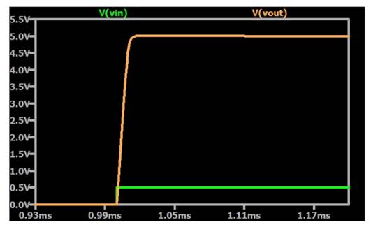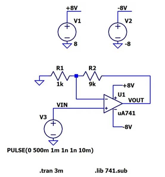 我們將運(yùn)算放大器配置為增益為 10 的同相放大器,以便預(yù)期輸出從 0V 快速轉(zhuǎn)變?yōu)?5V。