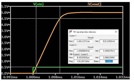 圖 4. LTspice 的光標(biāo)功能使我們能夠測量輸出斜坡的斜率。圖片由羅伯特·凱姆提供從V OUT = 0.5 V 到V OUT = 4.5 V的輸出信號(hào)看起來非常線性。上升時(shí)間約為 8.5 μs,接近我們的理論值。波形這部分期間的斜率為 470,851 V/s,約為 0.47 V/μs。這表明仿真中使用的 SPICE 模型成功地再現(xiàn)了預(yù)期的約 0.5 V/μs 的 741 轉(zhuǎn)換速率。
