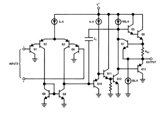 圖 6. LM124 運(yùn)算放大器的內(nèi)部原理圖。其補(bǔ)償電容標(biāo)記為C C 。圖片由德州儀器 (TI)提供內(nèi)部補(bǔ)償電容器使運(yùn)算放大器更加穩(wěn)定,但會(huì)降低壓擺率。非補(bǔ)償運(yùn)算放大器不使用補(bǔ)償電容器,而是受到較小寄生電容的限制。因此,它們提供了更高的轉(zhuǎn)換速率。 |