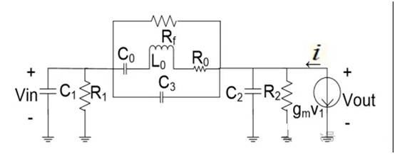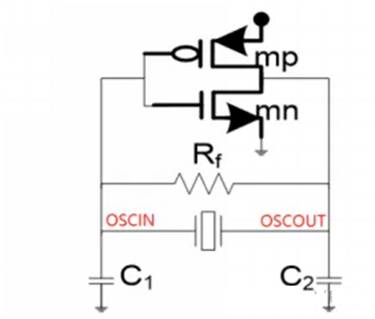 除了石英晶振外,mp、mn、Rf、C1、C2器件全部集成于芯片之中,考慮到OSCIN和OSCOUT引腳到地的等效電阻R1、R2,上圖的等效電路結(jié)構(gòu)如下圖: