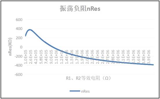 取T(s)函數(shù)的實(shí)部為nRes(稱為振蕩負(fù)阻),并將C0、 L0、R0、Rf、gm1、C1、C2合適的參數(shù)代入,并假設(shè)R1=R2,以R1、R2為變量,畫出R1、R2和nRes的關(guān)系圖如下: