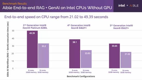 雖然在多數(shù)情況下,RAG功能需通過利用GPU和加速器的并行處理能力來實現(xiàn),但Aible的無服務(wù)器技術(shù)與英特爾至強處理器相結(jié)合,可使RAG用例完全由CPU來驅(qū)動。性能數(shù)據(jù)顯示,多款不同代際的英特爾至強處理器均可高效運行RAG工作負(fù)載。