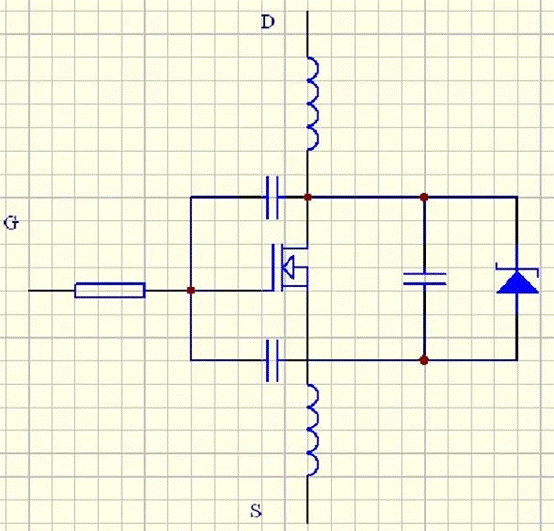 一般認(rèn)為MOSFET(MOS管)是電壓驅(qū)動(dòng)的,不需要驅(qū)動(dòng)電流。然而,在MOS管的G極和S極之間有結(jié)電容存在,這個(gè)電容會(huì)讓驅(qū)動(dòng)MOS變的不那么簡(jiǎn)單。下圖的3個(gè)電容為MOS管的結(jié)電容,電感為電路走線的寄生電感: