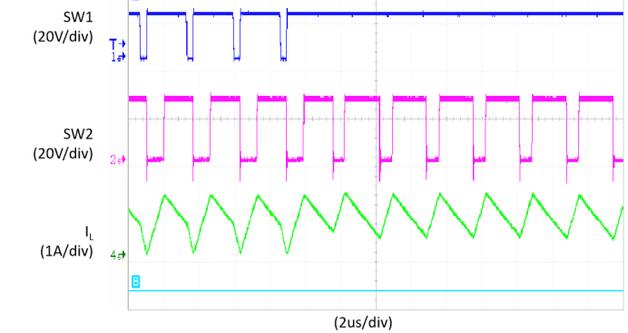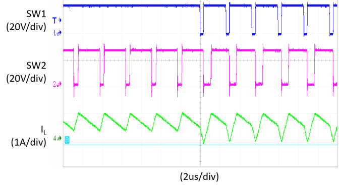 圖為由升降壓模式過渡到升壓模式,輸入端開關(guān)節(jié)點(diǎn)由開關(guān)變?yōu)橹蓖,顯示節(jié)點(diǎn)開關(guān)波形和電感電流波形變化。