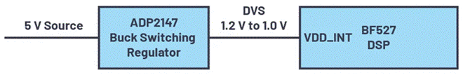 另一個(gè)DVS使用示例如圖2所示。在此示例中,ADP2147 降壓型開關(guān)穩(wěn)壓器為數(shù)字信號(hào)處理器(DSP)供電。在許多應(yīng)用中,都可以使用微控制器、DSP或FPGA來提高系統(tǒng)效率,方法是:在處理器處于待機(jī)模式時(shí)降低內(nèi)核電壓。在VDD_INT電壓(內(nèi)核電壓)降低(例如,在DSP在低負(fù)載狀態(tài)下運(yùn)行時(shí),從1.2 V降低至1.0 V)時(shí),多種DSP,包括ADI提供的ADSP-BF527 都可以更高效地運(yùn)行。處理器的功耗在很大程度上與其時(shí)鐘頻率和工作電壓的平方成比例。將ADSP-BF527的電源電壓降低25%,動(dòng)態(tài)功耗會(huì)降低超過40%。ADI的許多DSP都具有類似特性。