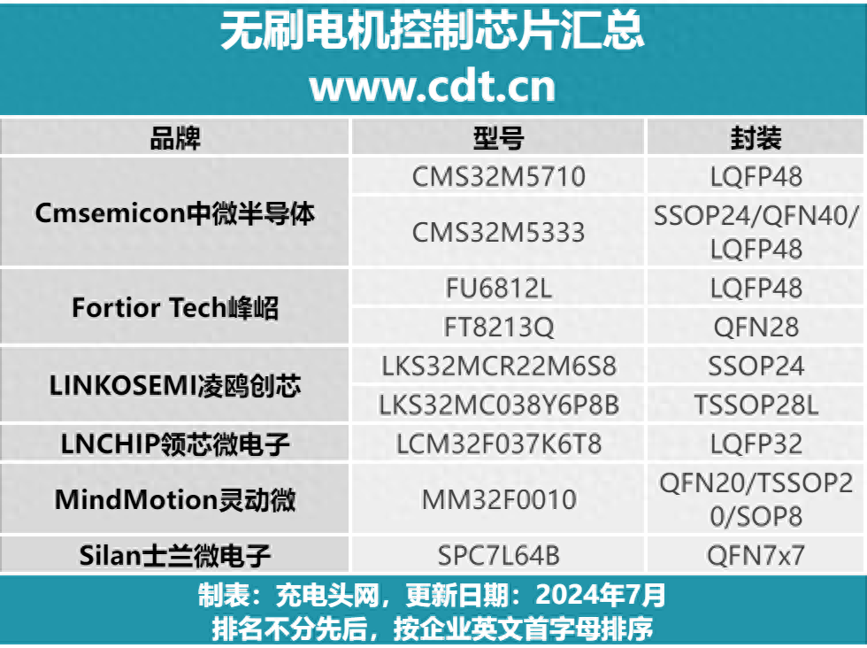 充電頭網(wǎng)從過往的拆解案例與新聞中匯總出目前市面上常見的無刷電機控制芯片,具體如下表所示。