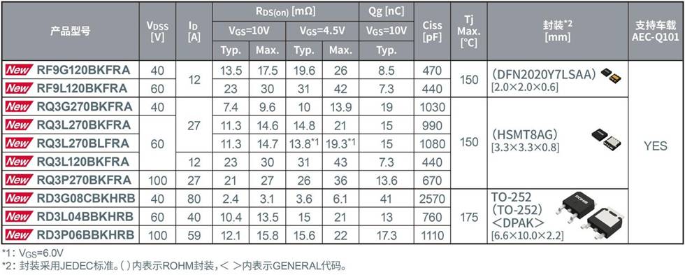 ROHM一直在為消費(fèi)電子和工業(yè)設(shè)備領(lǐng)域提供采用中等耐壓新工藝的低導(dǎo)通電阻MOSFET。此次通過(guò)將這種新工藝應(yīng)用于對(duì)可靠性要求高的車(chē)載產(chǎn)品,又開(kāi)發(fā)出具有低導(dǎo)通電阻優(yōu)勢(shì)的10款車(chē)載Nch MOSFET新產(chǎn)品。不僅有近年來(lái)需求高漲的2.0mm×2.0mm和3.3mm×3.3mm尺寸的小型封裝產(chǎn)品,還有傳統(tǒng)的TO-252封裝產(chǎn)品,未來(lái)將會(huì)繼續(xù)擴(kuò)大產(chǎn)品陣容并持續(xù)供應(yīng)。