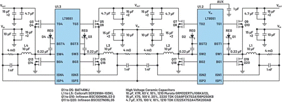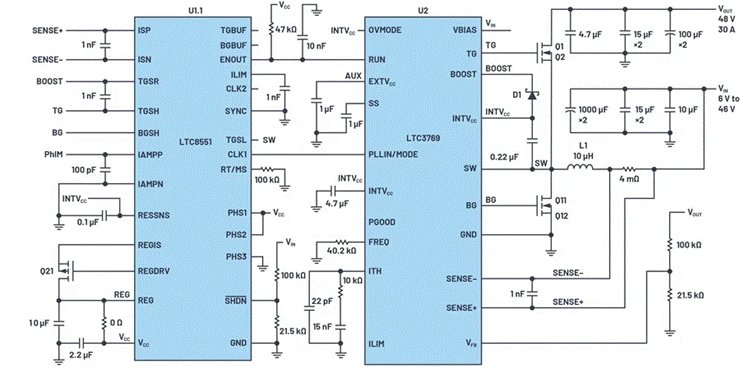 圖2. LT8551電源部分U1.2和U1.3的電路原理圖。LT8551連接至主升壓控制器的接口如圖1所示。VIN = 6 V 至 46 V, VOUT = 48 V (30 A時)。