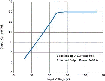 圖4. 轉(zhuǎn)換器輸入電壓與負載電流降額曲線。