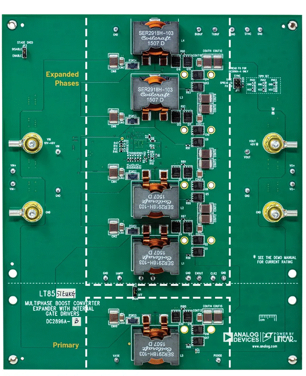 圖5所示為DC2896A-B評估電路圖片,包含指定的主相位和擴展相位。擴展相位的熱影像如圖6所示。