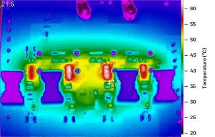 圖6. 在對流冷卻(無空氣流動)情況下,基于LT8551的演示電路的熱影像。25 A時, VIN = 24 V, VOUT = 48 V 。