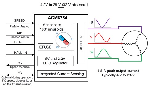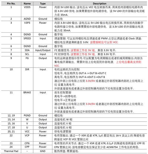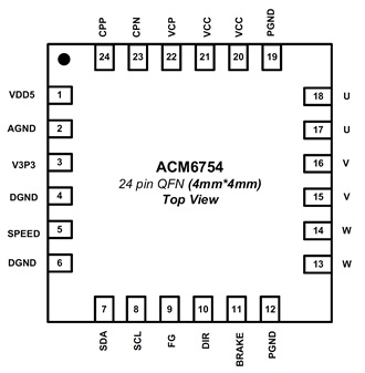 ACM6754是一款三相無刷直流電機(jī)驅(qū)動芯片,內(nèi)部集成無感三相無刷電機(jī)驅(qū)動算法、相電流檢測電流電路、柵極驅(qū)動電路以及功率MOS管. 支持最大4.8A的相電流. ACM6754的高集成度以及精簡外圍特別適用于高功率密度、小尺寸、靜音要求高的三相無刷電機(jī)驅(qū)動器