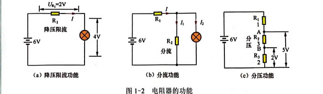 電阻器的功能主要有降壓限流、分流和分壓。電阻器的降壓限流、分流和分壓功能說明如圖1—2所示。