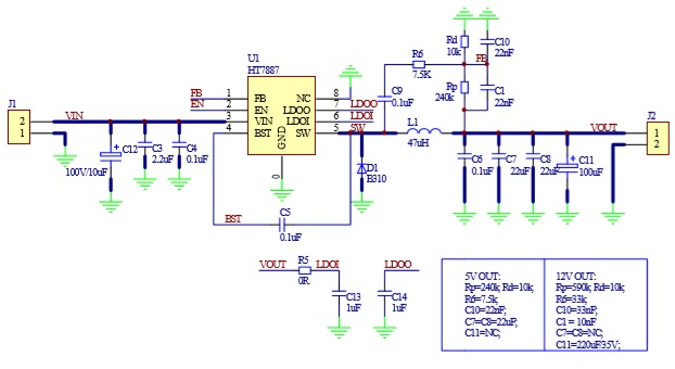 開(kāi)關(guān)頻率可高達(dá)1MHz,從而允許小尺寸的外圍器件。過(guò)熱保護(hù)和短路保護(hù)(SCP)使芯片具有較好的可靠性和容錯(cuò)機(jī)制。200µA的靜態(tài)電流允許HT7887用于電池供電的應(yīng)用中。