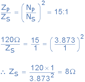 需要使用阻抗比為 15:1 的音頻變壓器來匹配功率放大器的輸出和揚聲器。如果放大器的輸出阻抗為 120Ω。計算功率傳輸所需的揚聲器的標(biāo)稱阻抗。