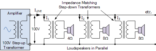 在這里,放大器使用升壓變壓器,在給定功率輸出的情況下,以較低的電流提供恒定的 100 伏傳輸線電壓。揚聲器并聯(lián)在一起,每個揚聲器都有自己的阻抗匹配降壓變壓器,以降低次級電壓并增加電流,從而使 100V 線路與揚聲器的低阻抗相匹配。