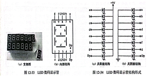 LED 數(shù)碼顯示管是一種常用的字符顯示器件,能與 CMOS、TTL 等集成電路直接配合,作靜態(tài)、動態(tài)掃描顯示之用。圖12-33(a)是LED數(shù)碼顯示管的實物圖,圖 12-33(b)是LED數(shù)碼顯示管的內(nèi)部結(jié)構(gòu)。它實際上是由8個發(fā)光二極管構(gòu)成的,其中7個發(fā)光二極管排列成“8”字形的筆畫段,另一個發(fā)光二極管為圓點(diǎn)形狀,安裝在顯示器的右下角作為小數(shù)點(diǎn)使用。通過發(fā)光二極管亮暗的不同組合,從而可顯示出0~9的阿拉伯?dāng)?shù)字符號以及其他能由這些筆畫段構(gòu)成的各種字符。
