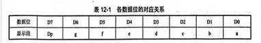 七段發(fā)光二極管,再加上一個小數(shù)點(diǎn)位,共計8位代碼,由一個數(shù)據(jù)字節(jié)提供。各數(shù)據(jù)位的對應(yīng)關(guān)系如表 12-1所示。