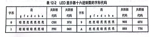 LED 數(shù)碼顯示管的字形(段)代碼見表 12-2。在程序設(shè)計時,表 12-2作為表格存入存儲單元,通過改變表格內(nèi)容使顯示字形變化。所以,用軟件譯碼字形顯示比較靈活。