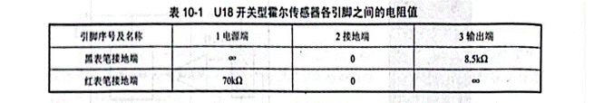 用MF-47型指針式萬(wàn)用表Rx1k擋測(cè)U18開關(guān)型爾傳感器各引腳之間的電阻值見表 10-1。