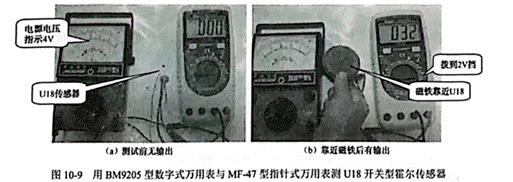用BM9205型數(shù)字式萬(wàn)用表與MF-47型指針式萬(wàn)用表測(cè)U18開關(guān)型爾傳感器如圖 10-9 所示。