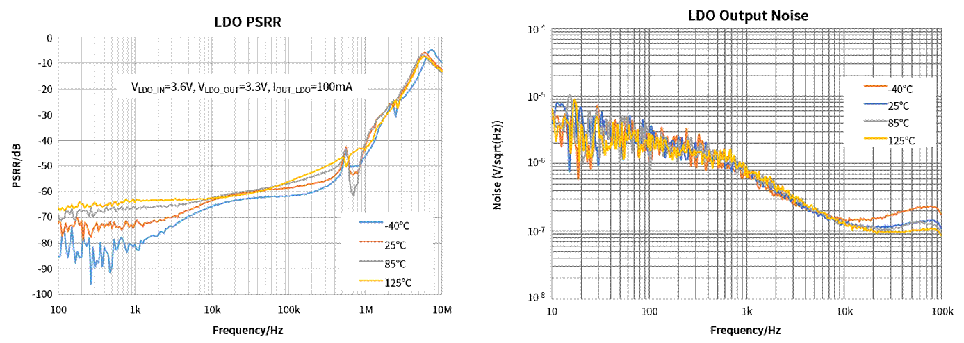 芯片集成的 LDO 同樣具備高穩(wěn)定性,1kHz 環(huán)境下的電源抑制比 (PSRR) 可達(dá) 70dB,典型場景下的輸出噪聲低至 60μV。