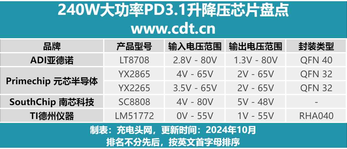 在現(xiàn)代電源管理技術(shù)中,升降壓控制器扮演著至關(guān)重要的角色,尤其是在需要高效能與靈活性的應(yīng)用場(chǎng)景中。充電頭網(wǎng)從上游供應(yīng)鏈獲取到最新推出的多款支持PD3.1 240W大功率的同步升降壓芯片,通過超高的效率,高度集成的設(shè)計(jì)和靈活的工作模式,這些芯片均能解決電源轉(zhuǎn)換過程中的效率和成本問題,展示出色的電源管理能力。