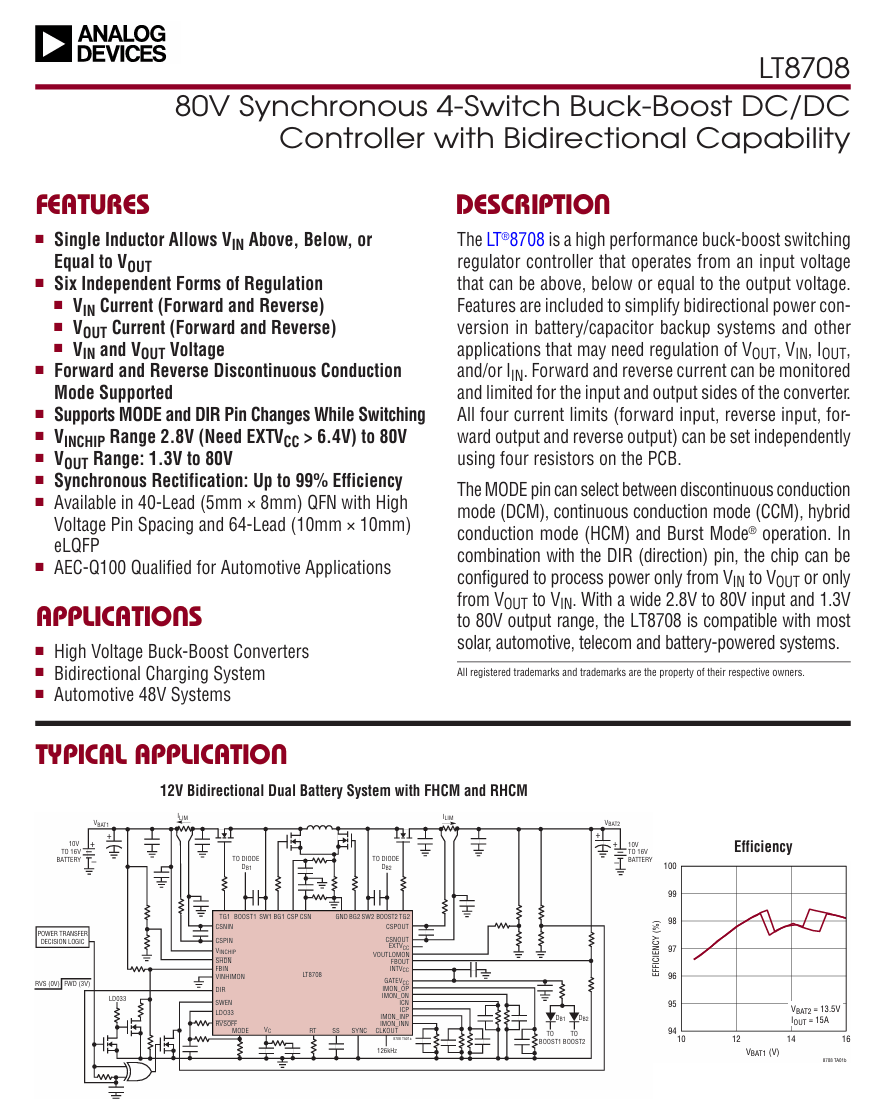 LT8708的工作電壓范圍為2.8V至80V,輸出范圍為1.3V至80V,支持高效的同步整流,最高效率可達(dá)99%。芯片能夠在斷續(xù)導(dǎo)通模式、連續(xù)導(dǎo)通模式、混合導(dǎo)通模式和Burst Mode等多種工作模式之間進(jìn)行切換,通過MODE和DIR引腳,該芯片可以在不同工作模式下進(jìn)行高效的雙向電源轉(zhuǎn)換。特別是在汽車48V系統(tǒng)和太陽能等需要高電壓升降壓轉(zhuǎn)換器的應(yīng)用場(chǎng)景中,LT8708表現(xiàn)優(yōu)異。