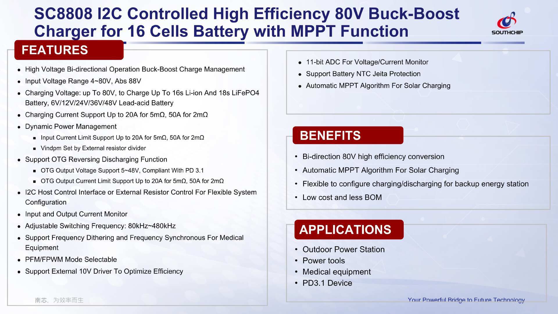 SC8808是南芯最新推出的一款高壓升降壓控制器,支持4到80V輸入電壓,充電電壓最高支持16串鋰電池、18串磷酸鐵鋰電池及各種鉛酸電池。