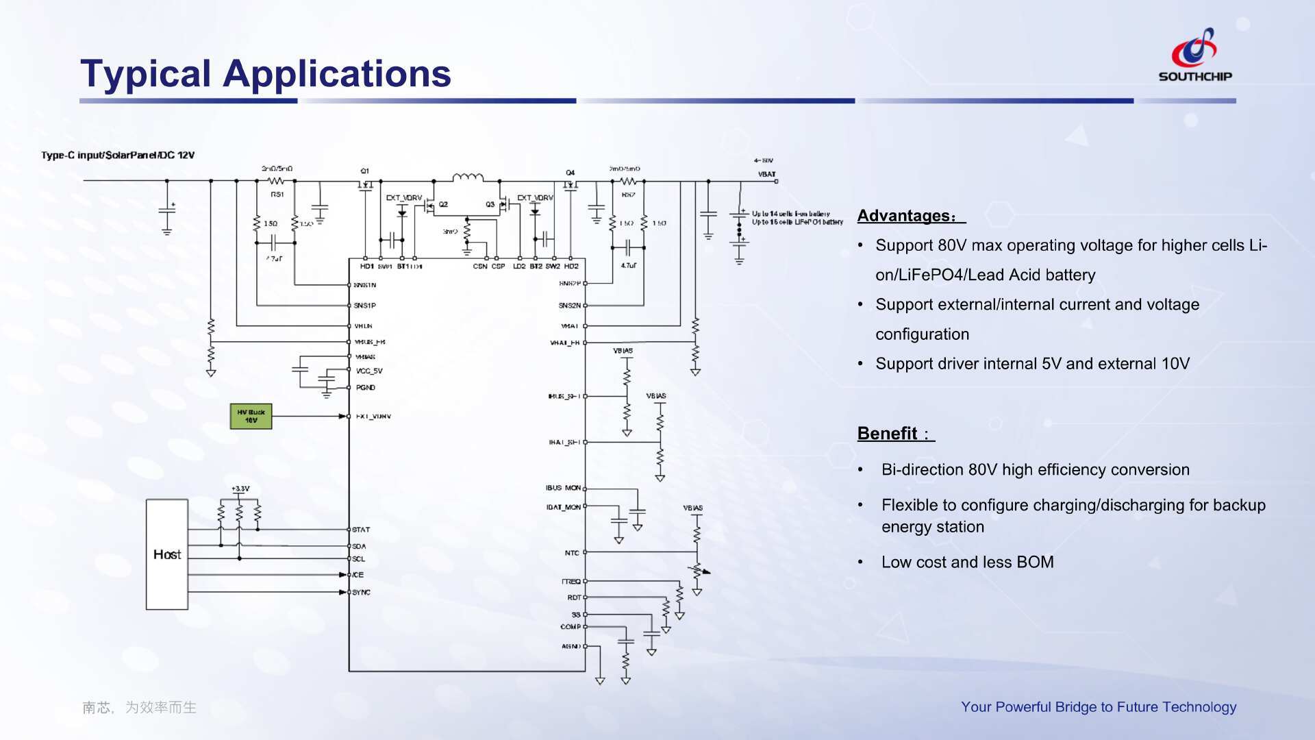 以上是SC8808典型應(yīng)用電路圖,左側(cè)支持USBC輸入和DC輸入,右側(cè)連接電池,可支持高達(dá)16串磷酸鐵鋰電池。該芯片的主要優(yōu)點(diǎn)包括寬輸入輸出電壓范圍,支持最大80V的輸入輸出,電壓和電流設(shè)定可通過外部或內(nèi)部I2C配置。驅(qū)動(dòng)電壓既可使用內(nèi)部的5V,也可使用外部的10V,以降低芯片功耗和溫升,并提高系統(tǒng)效率。