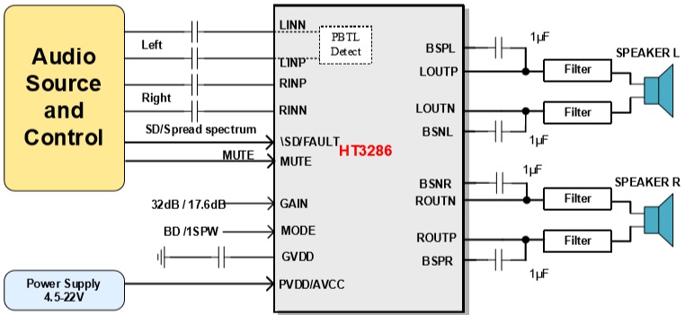 HT3286是一款高效D類音頻功率放大器。 在22V供電的立體聲(BTL)模式、THD+N=10% 條件下,能夠持續(xù)提供2*33W/8Ω功率輸出;在單聲道(PBTL)模式、THD+N=1%條件下,能夠持續(xù)提供50W/4Ω功率輸出。