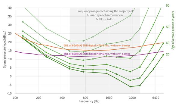 圖 3:中端和高端MEMS麥克風(fēng)的1/3倍頻程等效噪聲級ENL與典型男性聽力閾值的比較