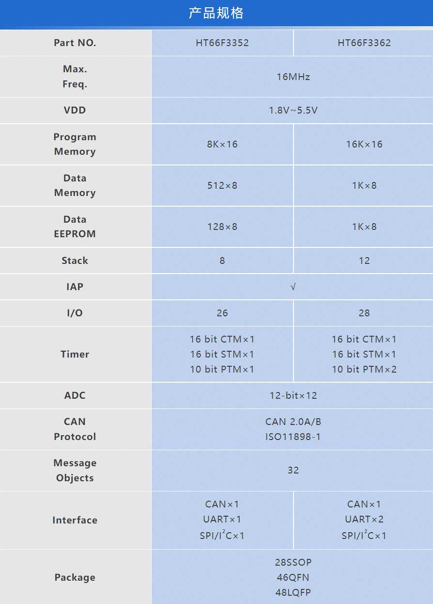 HOLTEK新推出HT66F3352/3362 CAN Bus MCU