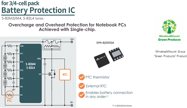 美蓓亞三美株式會社(MinebeaMitsumi Inc.) 旗下的艾普凌科有限公司(總裁:田中誠司,總部地址:東京都港區(qū),下稱“ABLIC”)今天推出針對筆記本電腦的二次保護IC「S-82M3/M4系列」、「S-82L4系列」。
