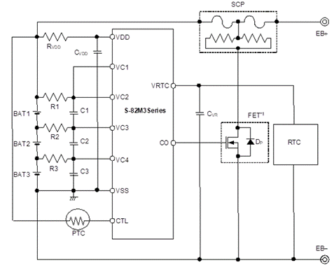 Figure: Example of a protection circuit using the S-82M3 Series