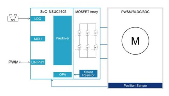 針對多樣化的場景,NSUC1602展現出了其廣泛的適用性。無論是汽車電子水泵、冷卻風扇、空調鼓風機,還是座椅調節(jié)、天窗控制、尾門控制等需要精確溫控與高效動力傳輸的BLDC和BDC應用,NSUC1602都能憑借其卓越的電機控制性能發(fā)揮關鍵作用。其優(yōu)化的電源管理方案,確保了這些設備在提供卓越性能的同時,還能實現能耗的大幅降低與使用壽命的顯著延長。
