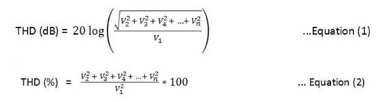總諧波失真定義為 ADC 輸出中諧波含量相對于基頻功率的功率。它可以分別按照方程(1)和(2)以分貝或百分比表示 。