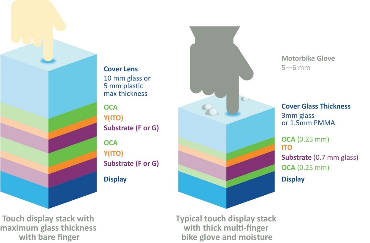 兩輪電動(dòng)車的觸摸屏經(jīng)常暴露在惡劣的戶外環(huán)境中,容易受到雨雪、灰塵或泥沙等的侵襲。在氣候炎熱的地區(qū),兩輪電動(dòng)車有時(shí)會(huì)停放在有陽光直射的地方,受到強(qiáng)烈的紫外線和紅外線照射。此外,它們還容易發(fā)生事故或遭到人為破壞。考慮到這些因素,兩輪電動(dòng)車適合采用IP65/68防護(hù)等級(jí)的觸摸屏和厚蓋板玻璃,以保護(hù)下方的觸摸傳感器和LCD或OLED顯示元件。為防止陽光和紫外線照射,需要采用紫外線/紅外線過濾器,同時(shí)還要應(yīng)用防反射/防眩光涂層來提高所有照明條件下顯示屏的可視性。因此,顯示屏疊層需要很厚的分層設(shè)計(jì),每增加一層,都會(huì)使手指與電容式觸摸傳感器的距離更遠(yuǎn)。距離越遠(yuǎn),就越難以準(zhǔn)確檢測屏幕表面的觸摸操作。
