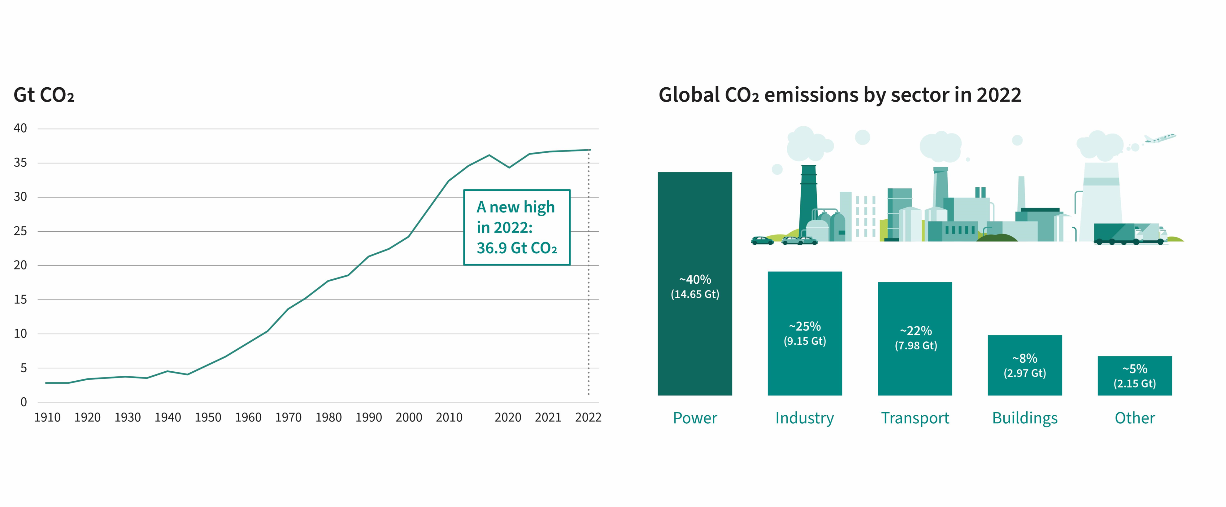 圖1:1910年以來(lái)全球二氧化碳排放量(單位:千兆噸):總量(左);按行業(yè)劃分(右)
