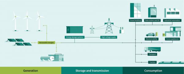 為了實(shí)現(xiàn)這些目標(biāo),我們必須找到解決方案,以便在電力全鏈條(發(fā)電、輸電、儲(chǔ)電和用電)的各個(gè)環(huán)節(jié)實(shí)現(xiàn)更智能、更高效的能源管理。而功率半導(dǎo)體技術(shù)則是這一鏈條各環(huán)節(jié)的核心所在。