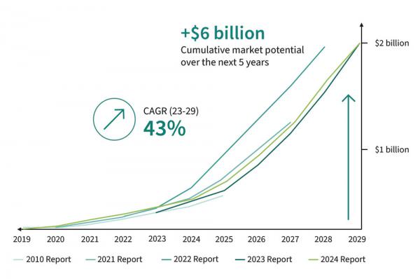 眾所周知,星巴克在運(yùn)營(yíng)中注重效率提升,力求消除生產(chǎn)過(guò)程中每一秒不必要的浪費(fèi)[4]。同樣,技術(shù)解決方案也應(yīng)該專注于在設(shè)計(jì)中提升每一個(gè)百分點(diǎn)的效率。寬禁帶半導(dǎo)體器件(特別是GaN)在這一領(lǐng)域?qū)⒋笥锌蔀椤D壳,GaN技術(shù)的一個(gè)典型應(yīng)用是,提升智能手機(jī)和筆記本電腦的充電器效率和功率密度,人們普遍認(rèn)為“GaN充電器”比非GaN充電器更新、更小、功率更高。然而,這只是GaN市場(chǎng)潛力的冰山一角。根據(jù)市場(chǎng)研究公司Yole Development的2023年GaN報(bào)告,2023年至2029年間,GaN技術(shù)的累計(jì)潛在市場(chǎng)規(guī)模達(dá)到60億美元,包括服務(wù)器、太陽(yáng)能、電動(dòng)汽車(chē)車(chē)載充電器和電機(jī)驅(qū)動(dòng)裝置等多個(gè)領(lǐng)域也正在加速向這項(xiàng)創(chuàng)新技術(shù)轉(zhuǎn)型[5]。