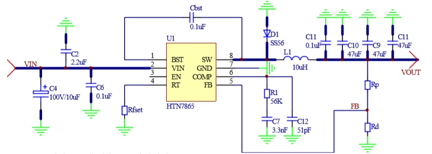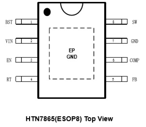 HTN7865是5A降壓轉(zhuǎn)換器,具有從4.5V到65V的寬輸入電壓,集成了90mΩ高側(cè)MOSFET。HTN7865采用峰值電流模式控制, 支持跳周期調(diào)制(PSM),有助于轉(zhuǎn)換器在輕負(fù)載下實(shí)現(xiàn)高效率。HTN7865具有100kHz至2MHz的可編程開(kāi)關(guān)頻率,外部電阻可調(diào)。 HTN7865允許從高輸入電壓到低輸出電壓的功率轉(zhuǎn)換,開(kāi)關(guān)MOS的最小導(dǎo)通時(shí)間為120ns。 該設(shè)備提供典型2.5ms的固定軟啟動(dòng),以防止啟動(dòng)過(guò)程中的涌入電流。HTN7865具有外部環(huán)路補(bǔ)償功能,可靈活優(yōu)化環(huán)路穩(wěn)定性或環(huán)路響應(yīng)。HTN7865提供逐周期電流限制、熱關(guān)斷保護(hù)、輸出過(guò)壓保護(hù)、輸出過(guò)載保護(hù)和輸入電壓欠壓保護(hù)。該設(shè)備采用ESOP8封裝。